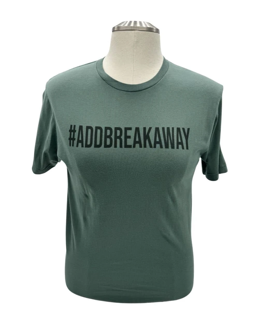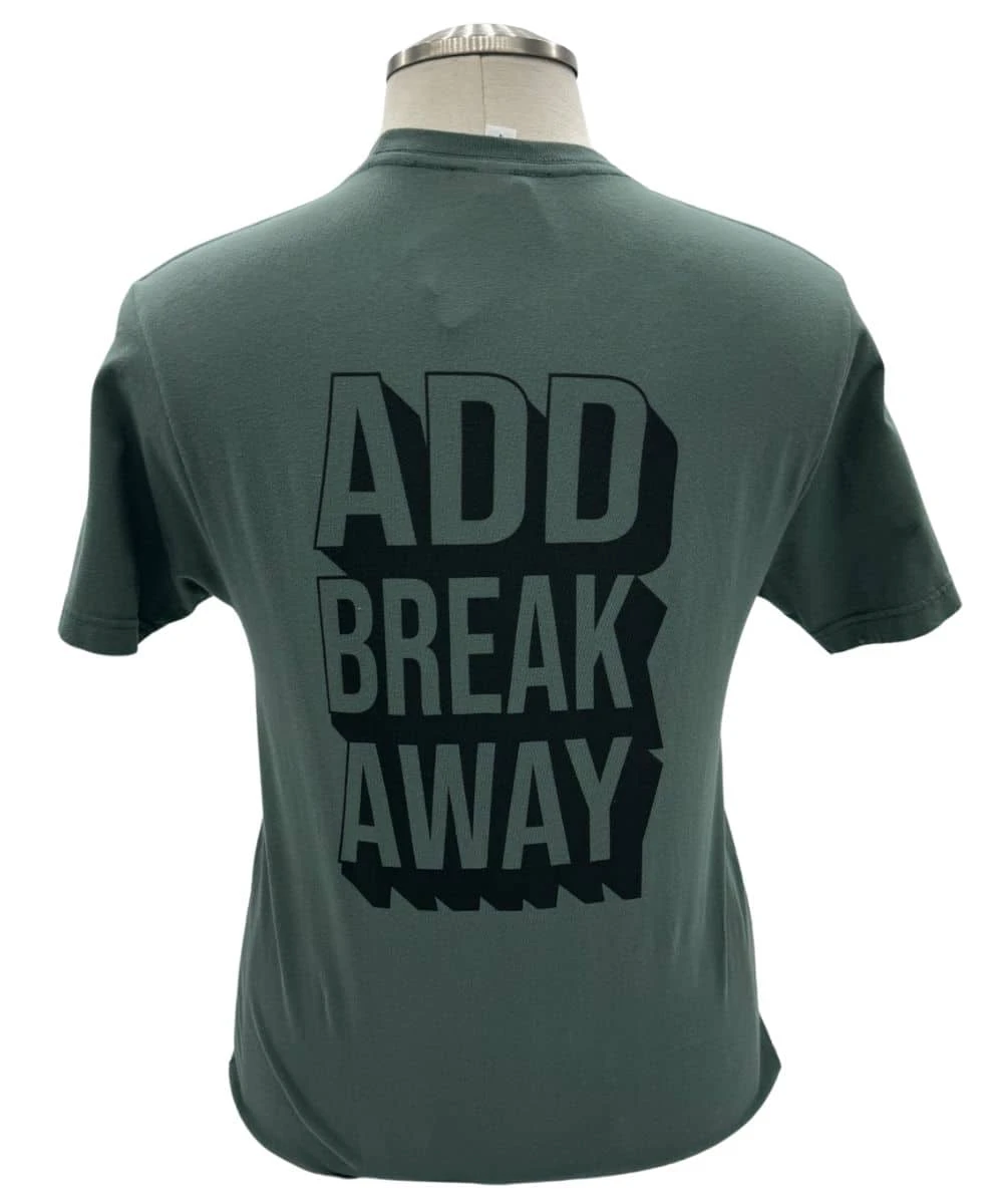 Soft Graphic Tee; Front Chest Screen Print Reads: “ADDBREAKAWAY”; Large Back Screen Print Reads: “ADD BREAK AWAY”; Unisex Fit; Color: Basil; Style #T2203-1