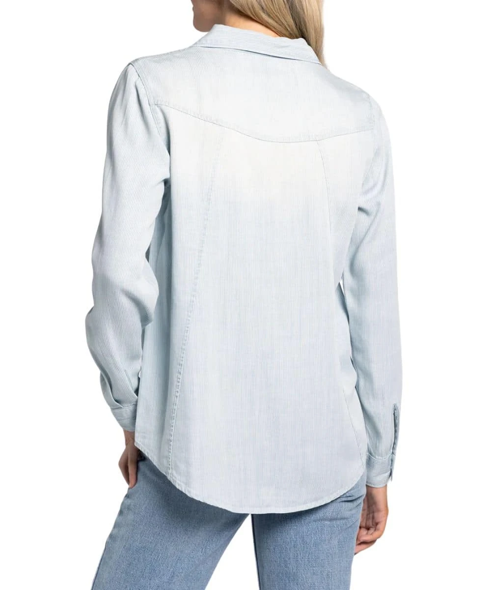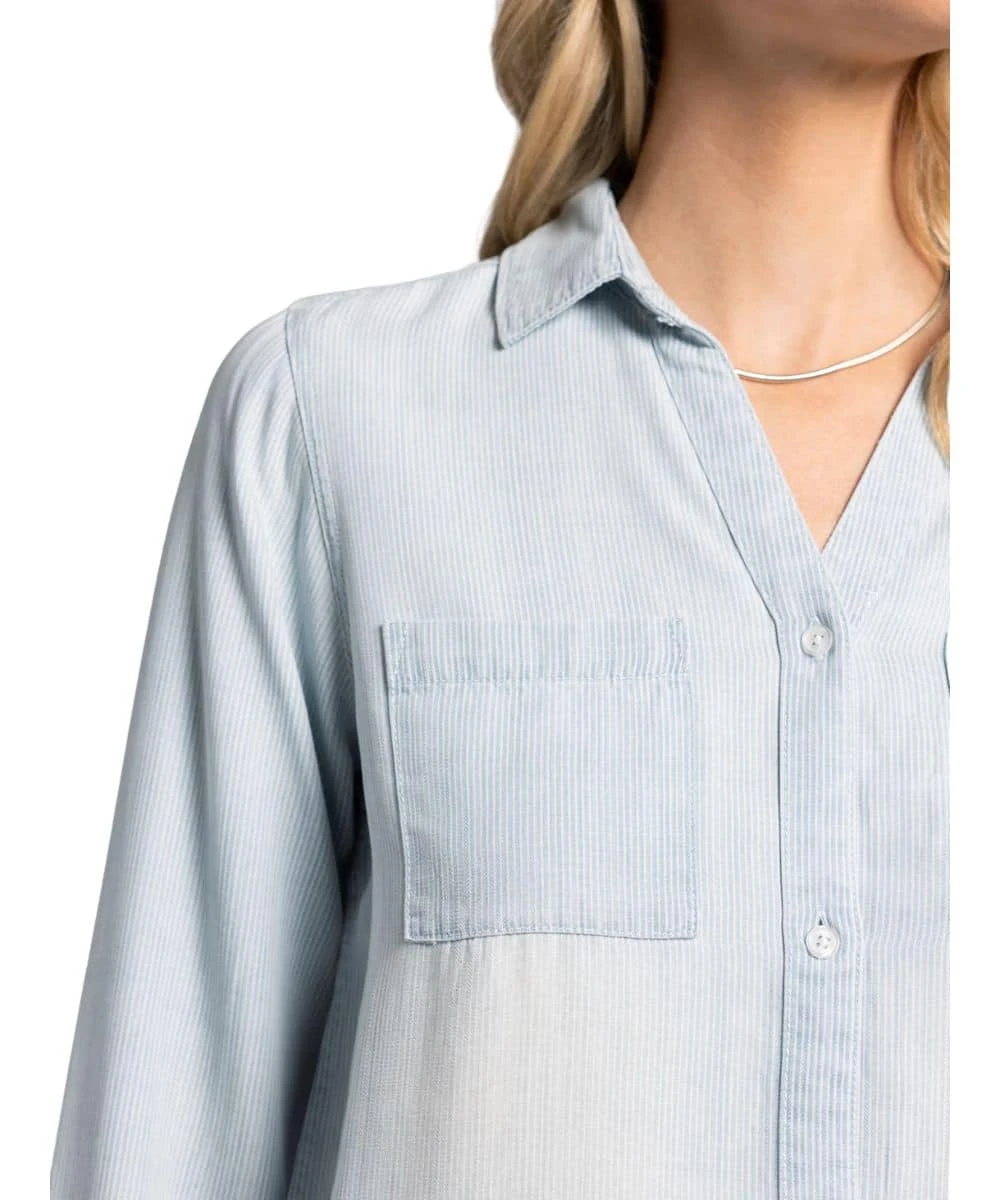 100% Tencel Lyocell; Lightweight And Breathable Material; Relaxed Fit; Long Sleeves; Spread Collar; V-Neckline; Button Down Placket And Cuffs; Open Chest Pockets; Mia Pinstripe; Color: Light Blue; Style #T8035LZTTS