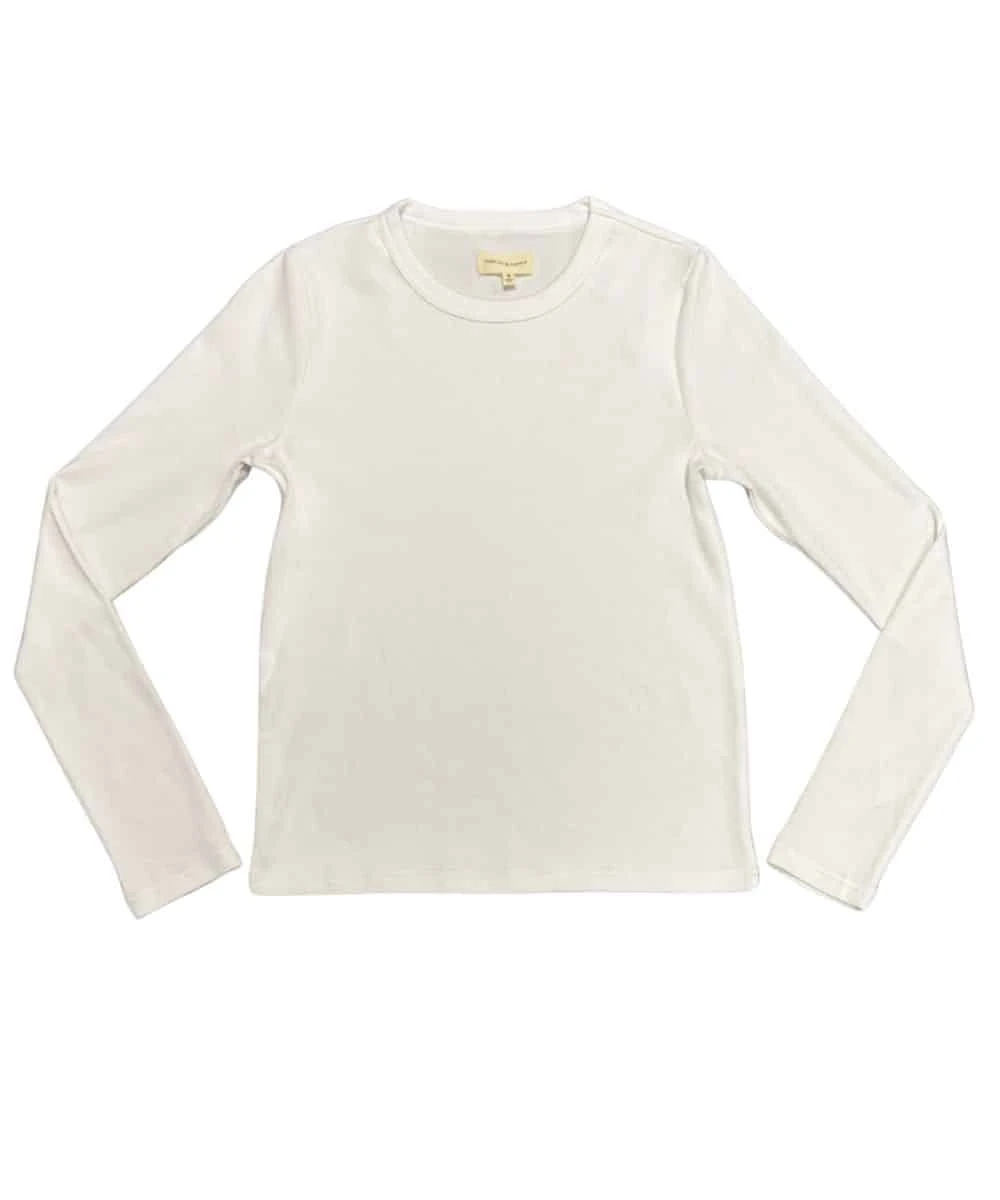 50% Cotton/45% Modal/5% Spandex; Slim Fit; Long Sleeves; Crew Neckline; Ribbed Knit Fabrication; Color: White; Style #T2960BRTS