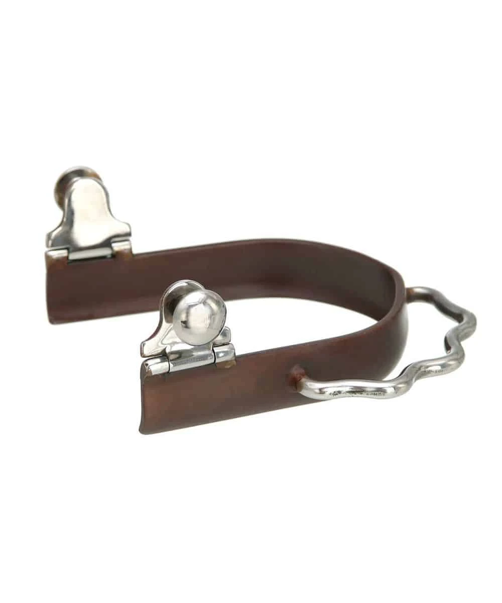 Stainless Steel Buttons And Bumper; Bumper Style Spur; Prevents Having To Twist The Knee Or Heel To Make Contact; 3/4″ Wide Band; 3 1/4″ Heel Band Opening; Sold As A Pair; Color: Antique Brown; Style #78-2601L