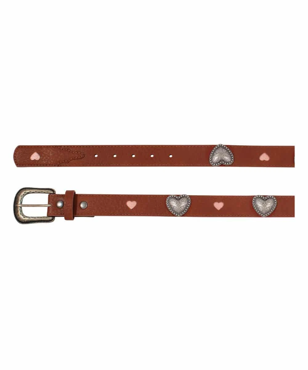 1″ Wide Faux Leather Belt; Etched Silver Tone Heart Shaped Conchos; Pink Heart Underlays; Single Keeper; Silver Tone Etched Buckle; Color: Tan; Style #2510370253