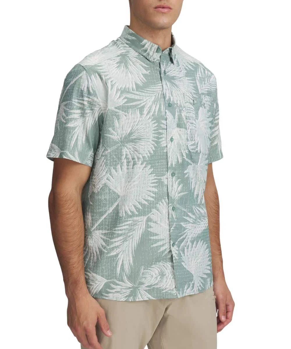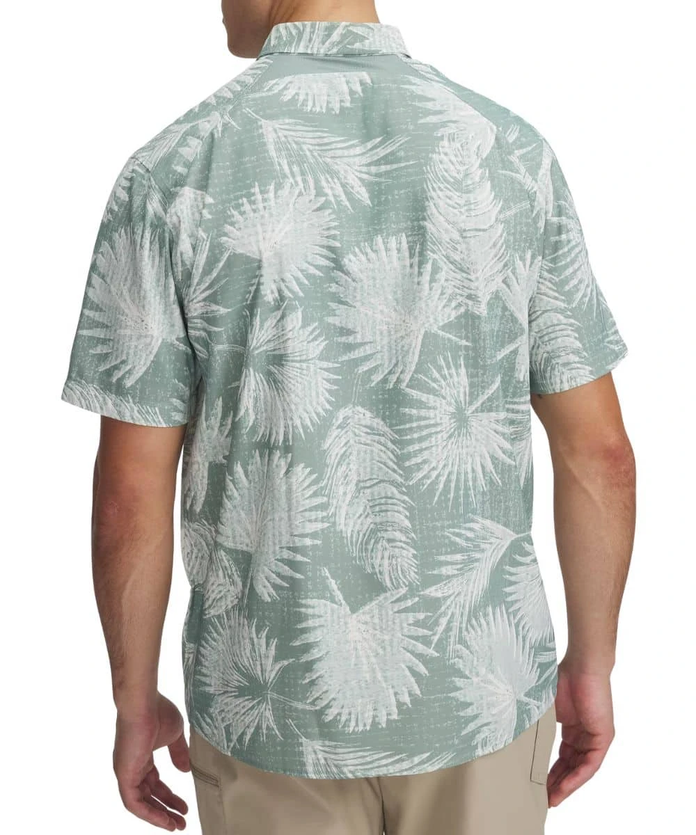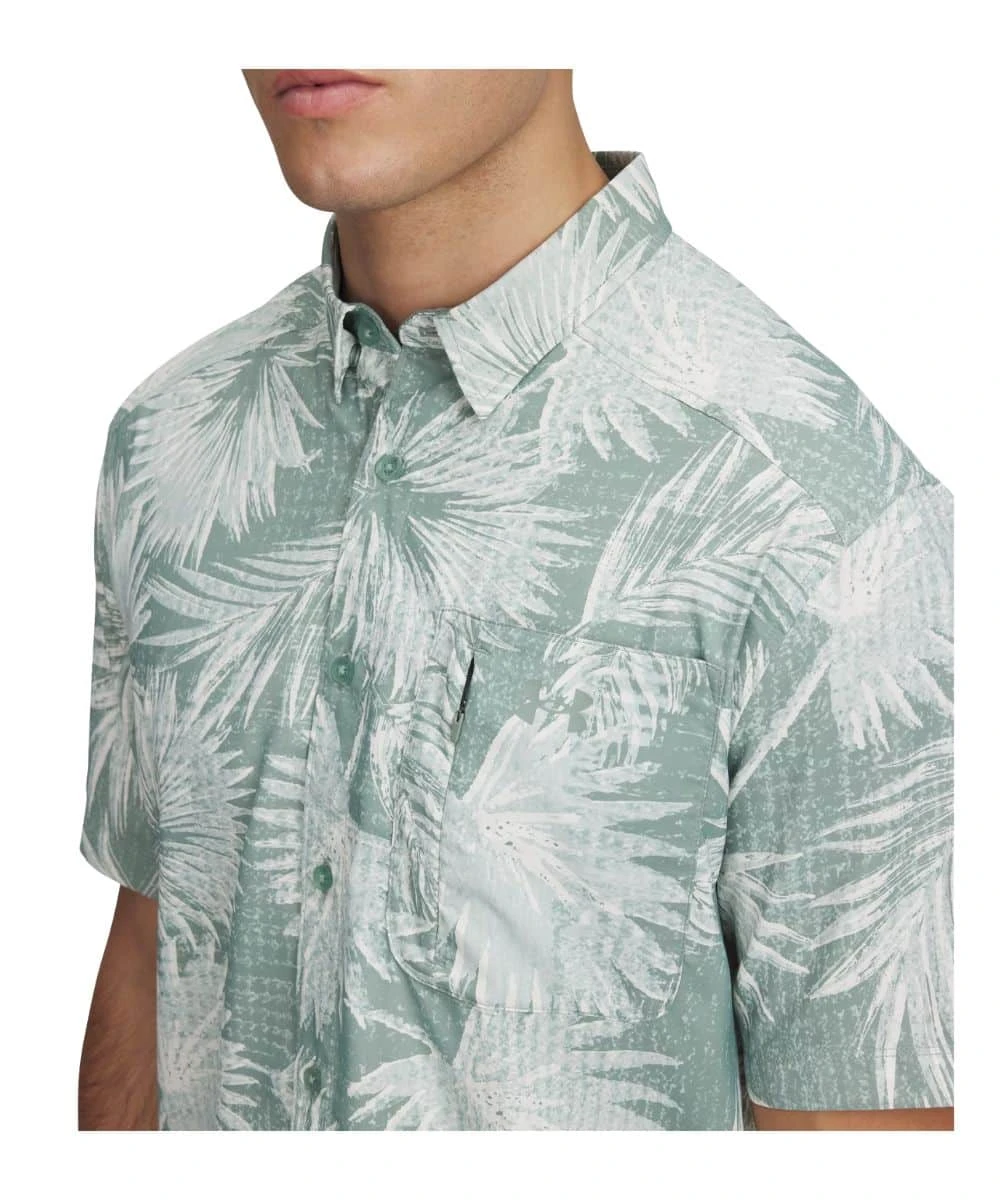 100% Polyester; Lightweight Stretch-Woven Fabric Is Durable And Comfortable; Loose Fit; Short Sleeves; Hidden Snap Down Collar; Button Down Placket; Secure Chest Pocket With Logo Embroidery; Built-In Sunglasses Wipe On Center Placket; Stretch Mesh Panels For Added Ventilation; UPF 50+ Protects Your Skin From The Sun’s Harmful Rays; Stain Release Material Keeps Blood, Guts, And Dirt From Soaking In; Material Wicks Sweat And Dries Really Fast; Silica Green/Hydro Green Tropical Print; Color: Green; Style #1376577-348