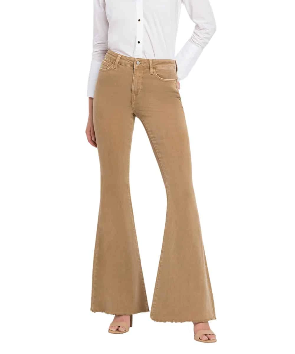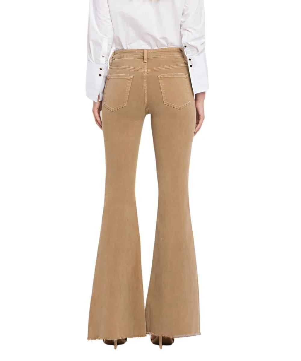 92% Cotton/6% Polyester/2% Spandex; Comfort Stretch Denim; High Rise (12″ Front Rise); Zip Fly With Button Closure; Five Pocket Styling; Super Flare Leg (27″ Leg Opening); 34″ Inseam; Raw Hem; Color: Tan/Conquer; Style #V3084