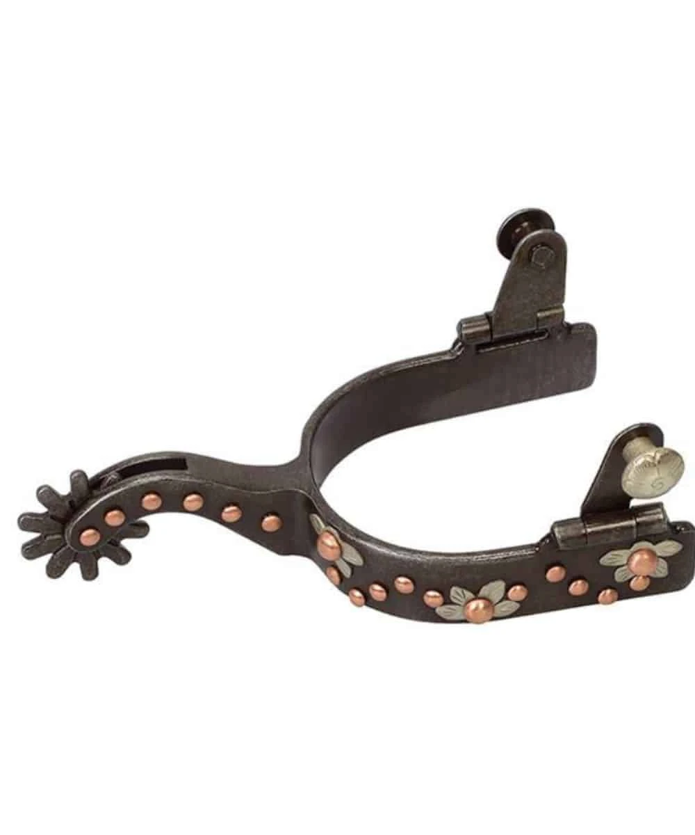 3/4″ Wide; German Silver Floral Engraved Trim; These Spurs Were Designed With The Right Weight And Balance So They Hang Properly On The Boot Without Riding Up; Color: Buffed Brown; Style #25-7832