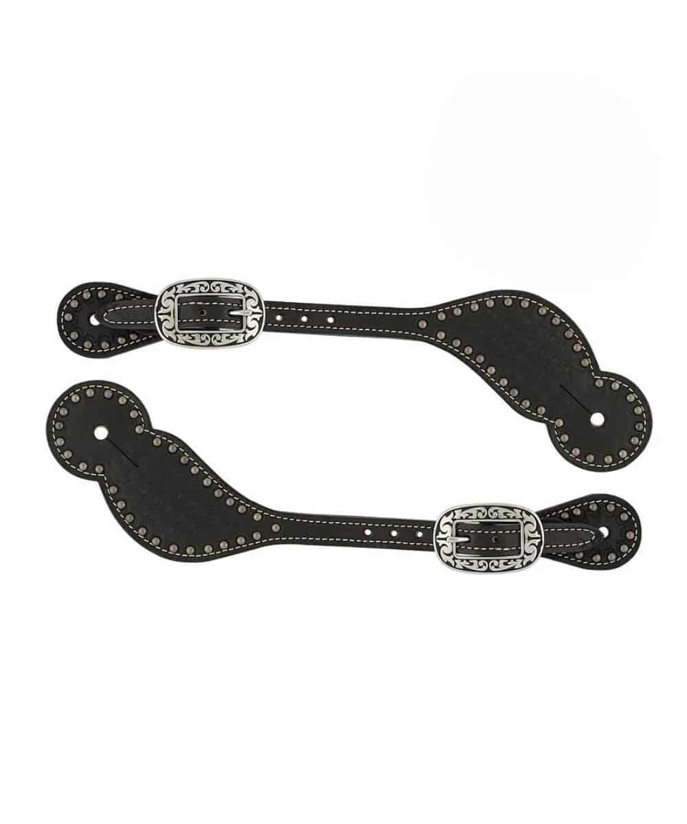 Regular Spur Straps; Refined English Bridle Leather With Basketweave Embossing And Pewter Spots; Floral Engraved Stainless Steel Hardware In An Oval Shape; Sold As A Pair; Color: Black; Style #30-0297-BK