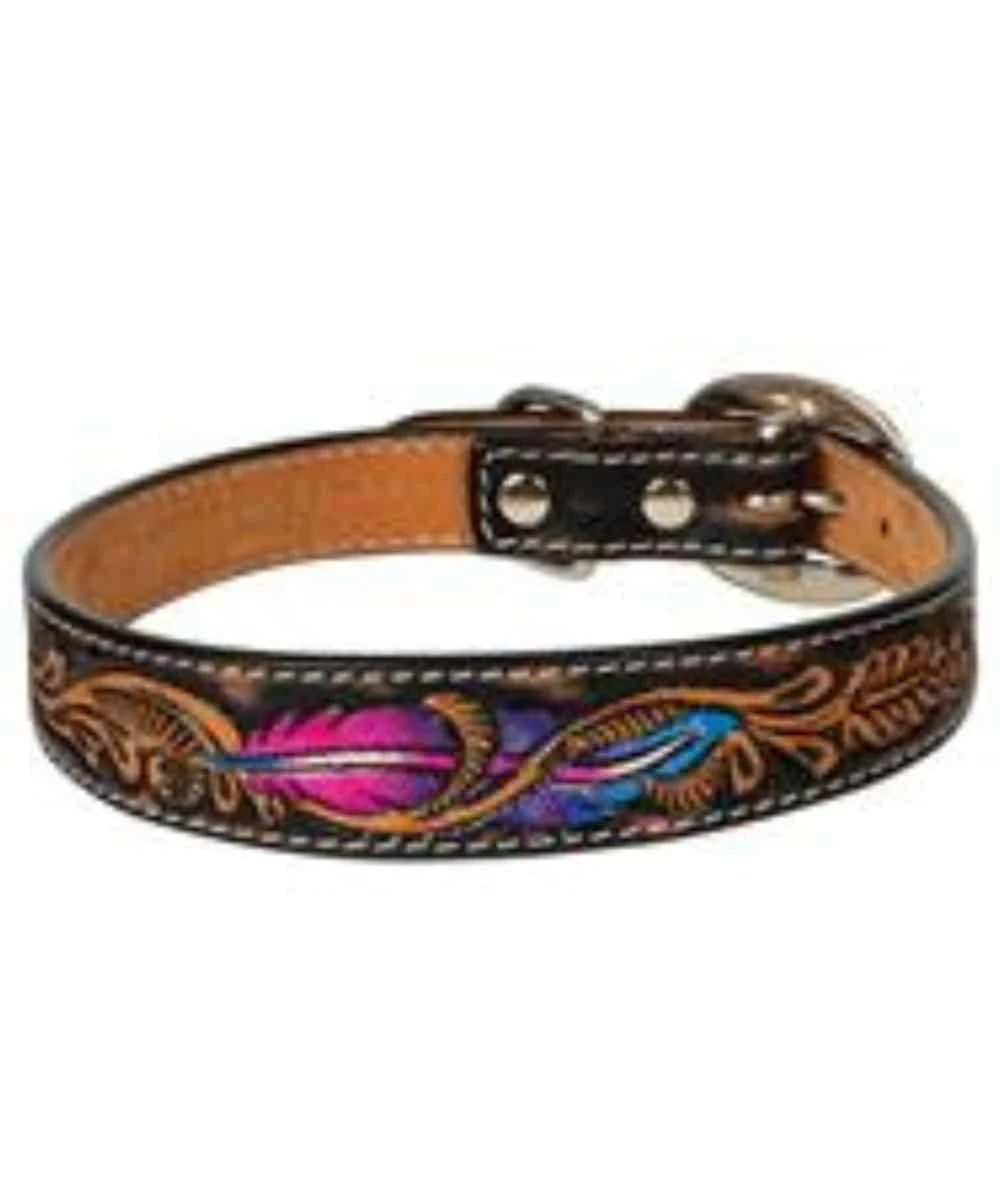 Light Oiled Leather; Hand Painted Feather Accents; Non-Rust Stainless Steel Hardware; 1″ Wide; Style #06004-16