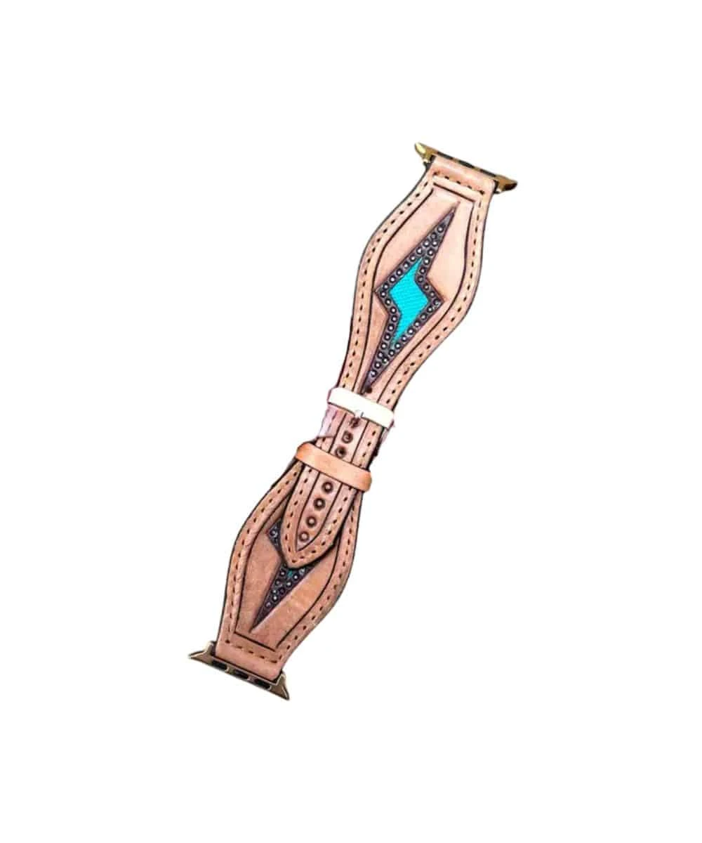 High-Quality Leather Apple Watch Band; Turquoise Lightning Bolt; Intricate Stitching; Classic Buckle For A Secure Fit; Made In The USA; Color: Tan; Style #TURQ BOLT-AWB