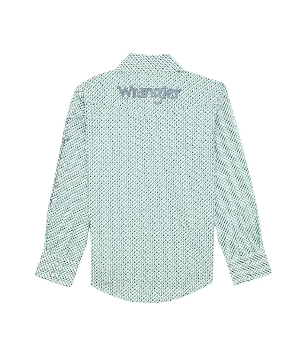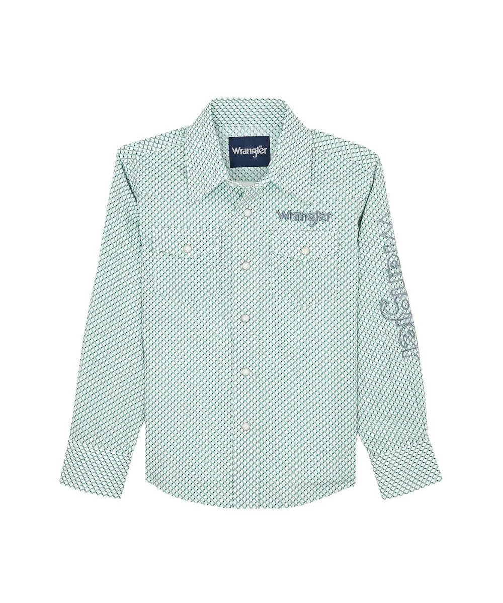 100% Cotton; Classic Fit; Long Sleeves; Spread Collar; Snap Front Placket And Cuffs; Single Point Snap Flap Chest Pockets; Wrangler Logo Embroidery On Chest, Sleeve, And Back; Single Point Western Yokes; Grassy Geometric Print; Color: Green; Style #112367718