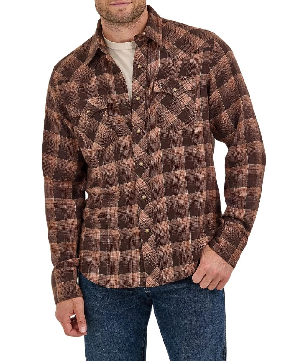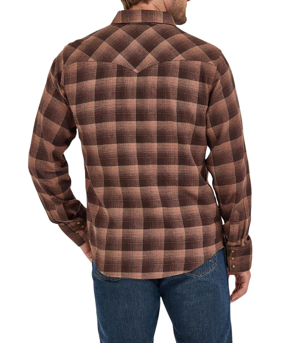 100% Cotton; Slim Fit; Long Sleeves; Spread Collar; Snap Front Placket And Cuffs; Single Point Snap Flap Chest Pockets With Logo Embroidery; Single Point Western Yokes; Mocha Brown Plaid Print; Color: Brown; Style #112368072