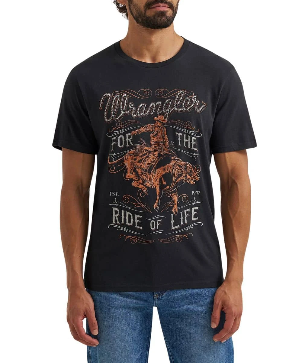 100% Cotton; Regular Fit; Short Sleeves; Crew Neck; Front Screen Print Reads: “For The Ride Of Life” With Logo And Bull Rider Graphic; Color: Jet Black; Style #112365295