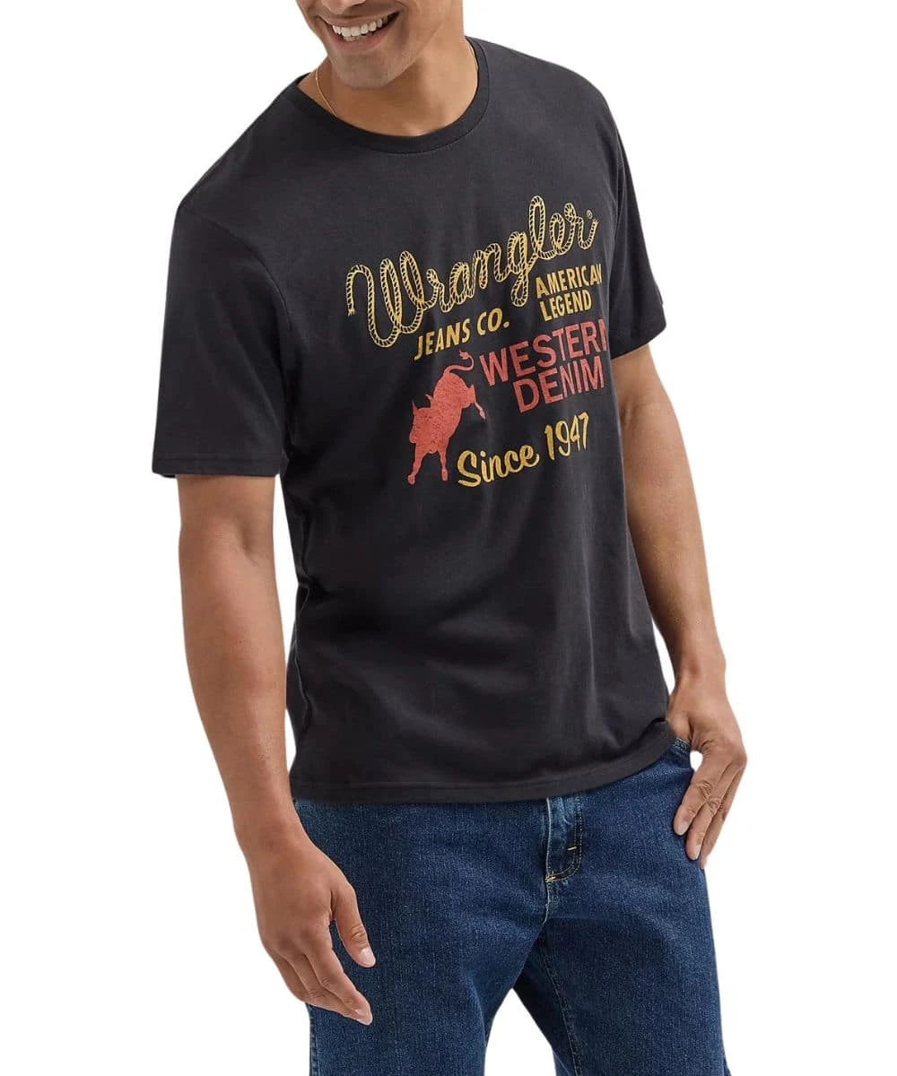 100% Cotton; Crew Neck; Screen Printed Rope Logo With “Western Denim” Bull Graphic On Front; Short Sleeves; Regular Fit; Color: Washed Black; Style #112353904