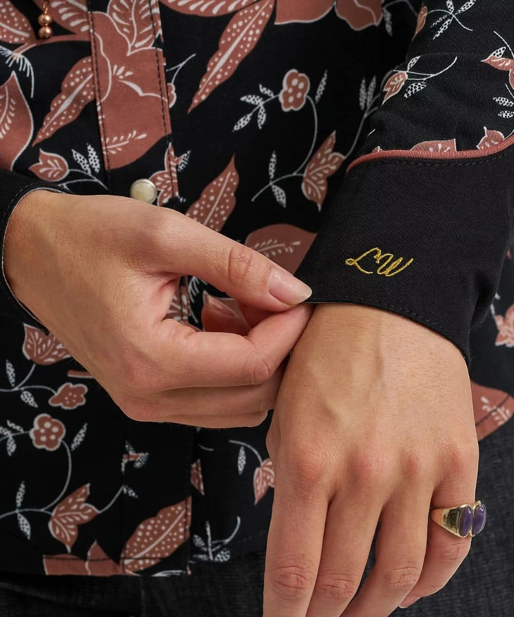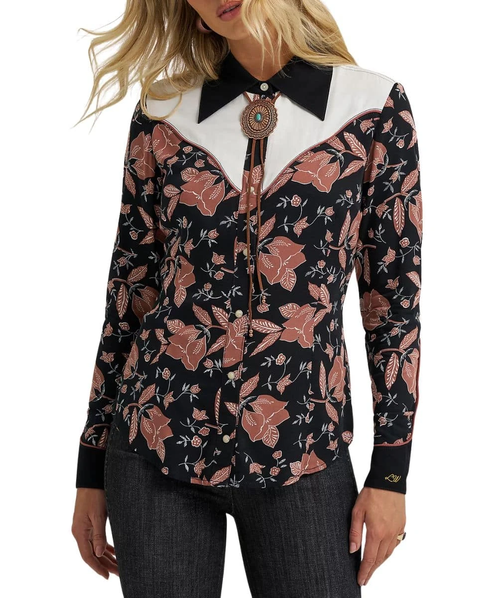 100% Viscose; Slim Fit; Long Sleeves; Spread Collar; Snap Front Placket And Shotgun Cuffs; Pearl Snaps; Curved Western Yokes; Princess Seams Detailed Front; Darted Details On Back; Lainey Wilson’s Monogram Embroidered At The Cuff; Folk Floral Print; Color: Black; Style #112368255