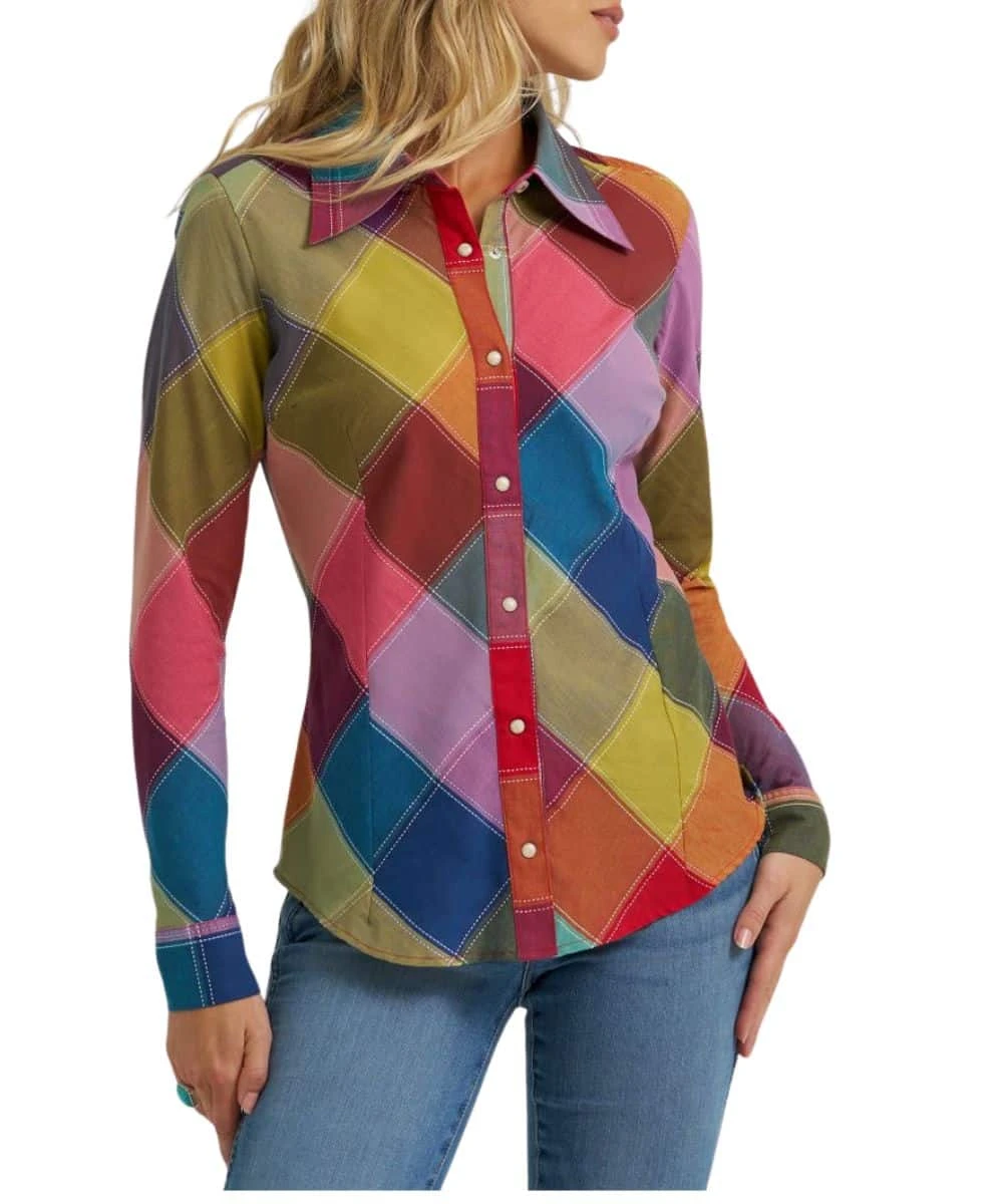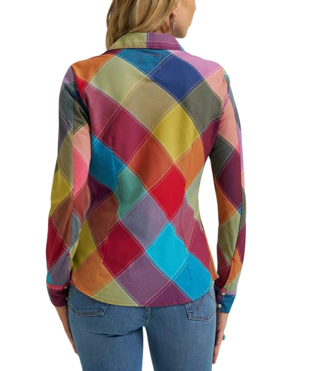 55% Cotton/45% Polyester; Slim Fit; Long Sleeves; Spread Collar; Snap Front Placket And Cuffs; Pearl Snaps; Princess Seams Down The Front; Darting Details In The Back; Lainey Wilson’s Monogram Embroidered At The Cuff; Geometric Print Featuring Accent Stitching; Color: Harlequin; Style #112371988