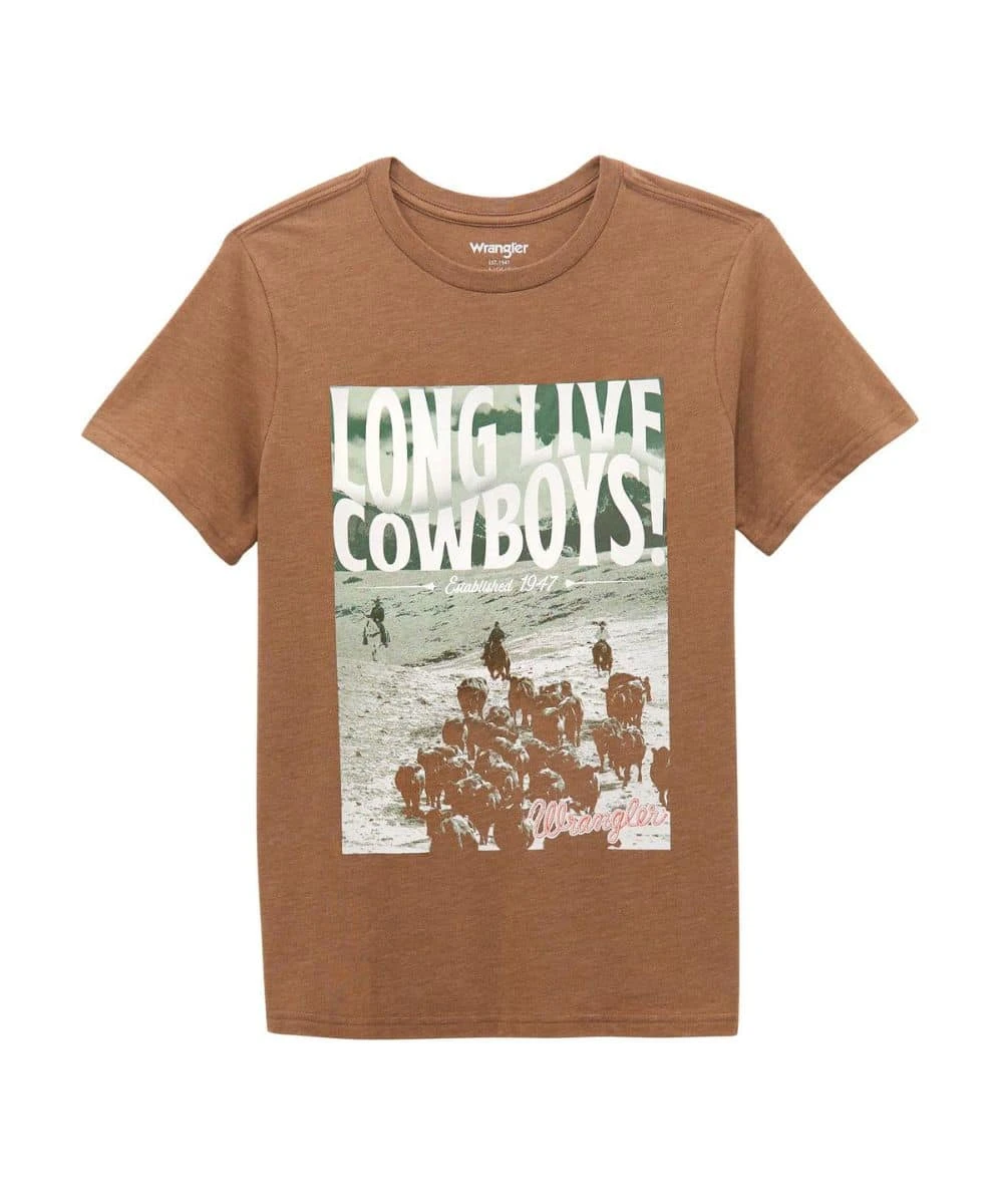 50% Cotton/50% Polyester; Regular Fit; Short Sleeves; Crew Neck; Front Screen Print Reads: “Long Live Cowboys!” With Cowboy Graphic; Color: Brown/Cacao Nibs Heather; Style #112365135
