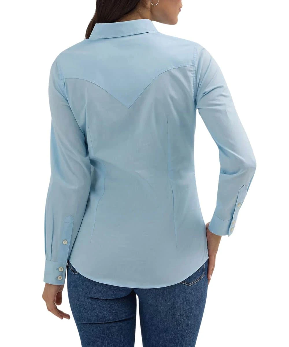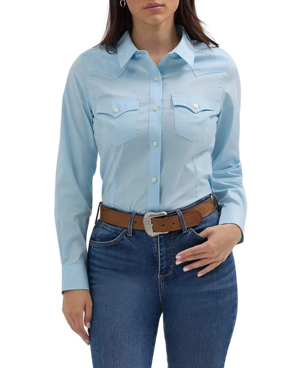 97% Cotton/3% Spandex; Slim Fit; Long Sleeves; Spread Collar; Button Down Placket And Cuffs; Single Point Button-Through Flap Chest Pockets With ‘W’ Stitching; Single Point Western Yokes; Solid Print; Color: Cool Blue; Style #112358015