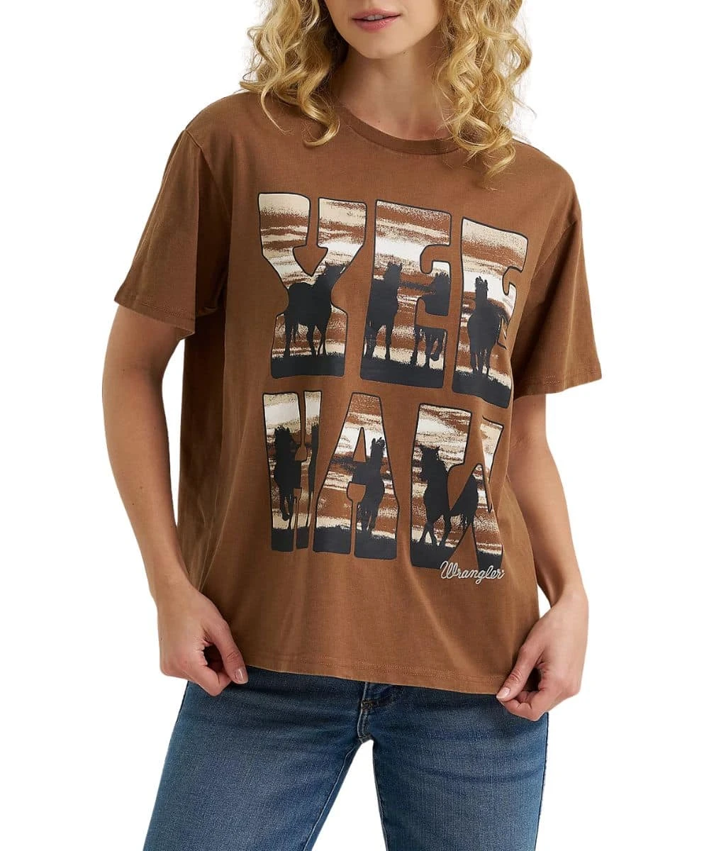 100% Cotton; Girlfriend Fit; Short Sleeves; Crew Neck; Dropped Shoulders; Front Screen Print Reads: “Yeehaw” With Western Horse Graphic Fill; Color: Brown/Cacao Nibs; Style #112366374